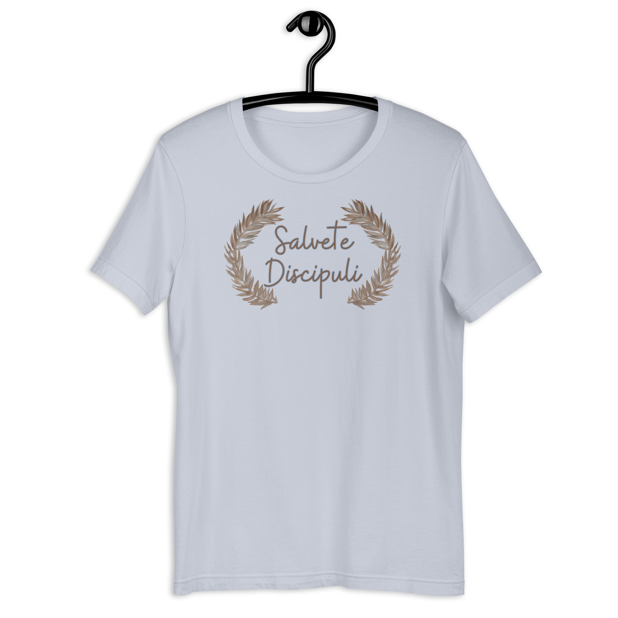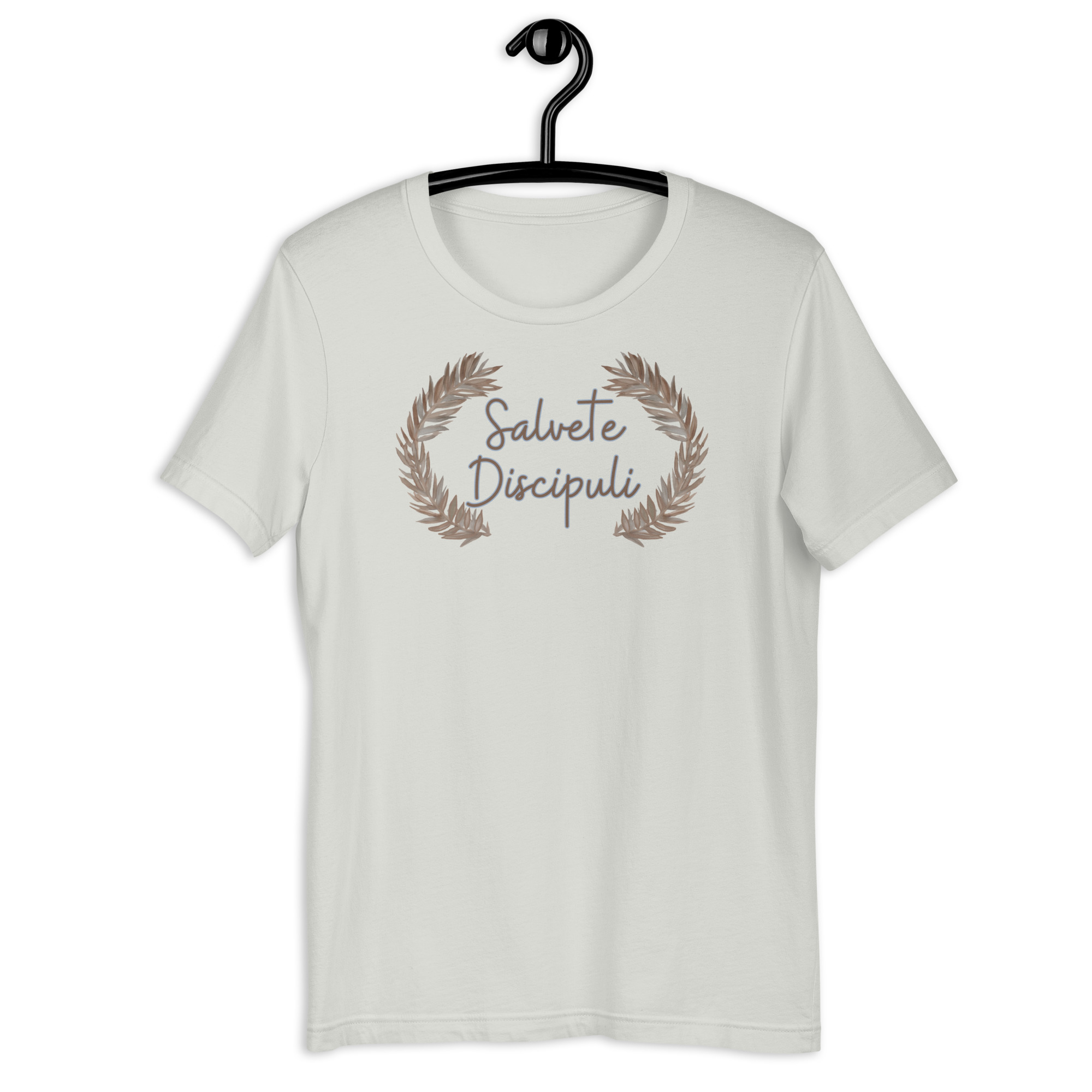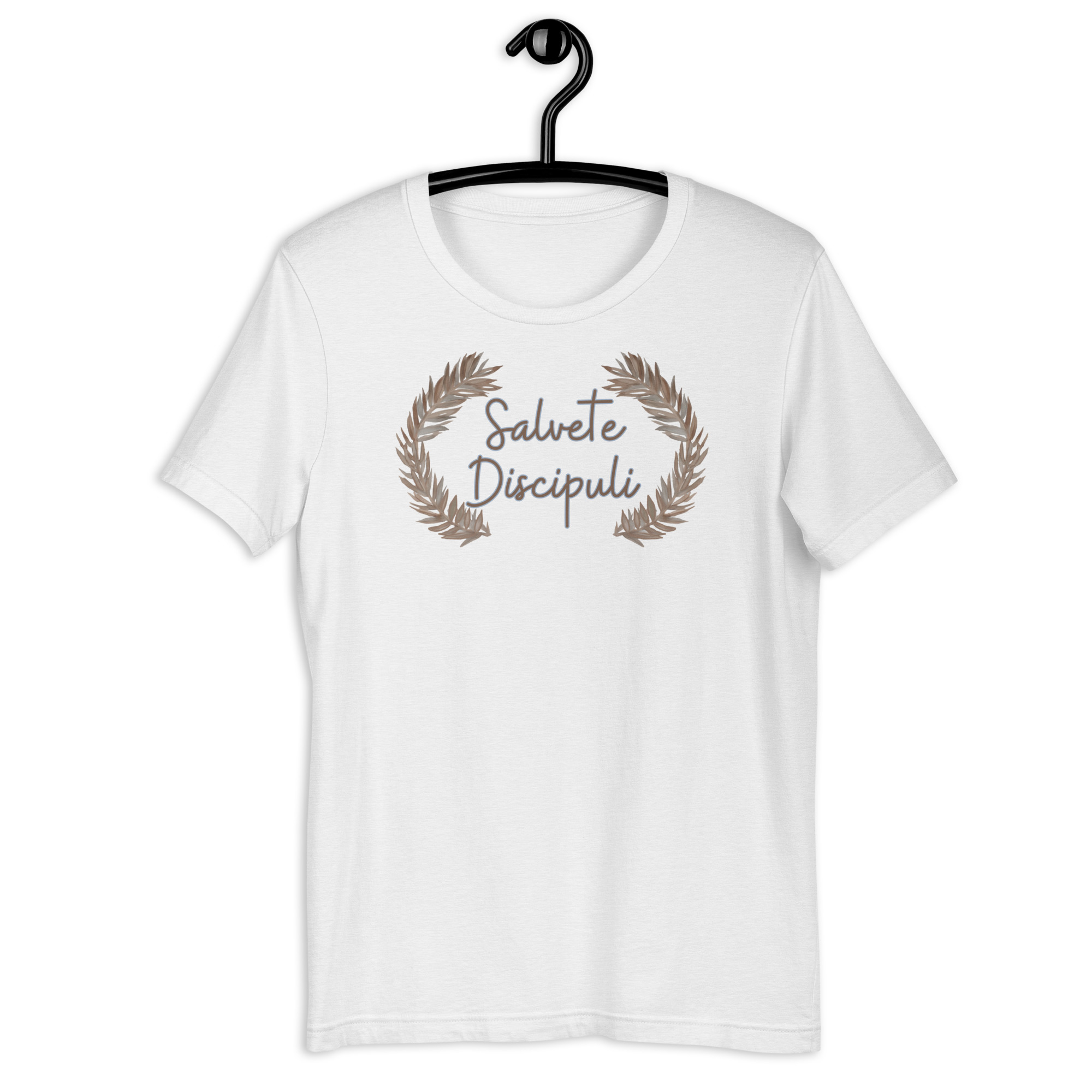 Salvete Discipuli Latin Hello Students T-Shirt with laurel leaves.