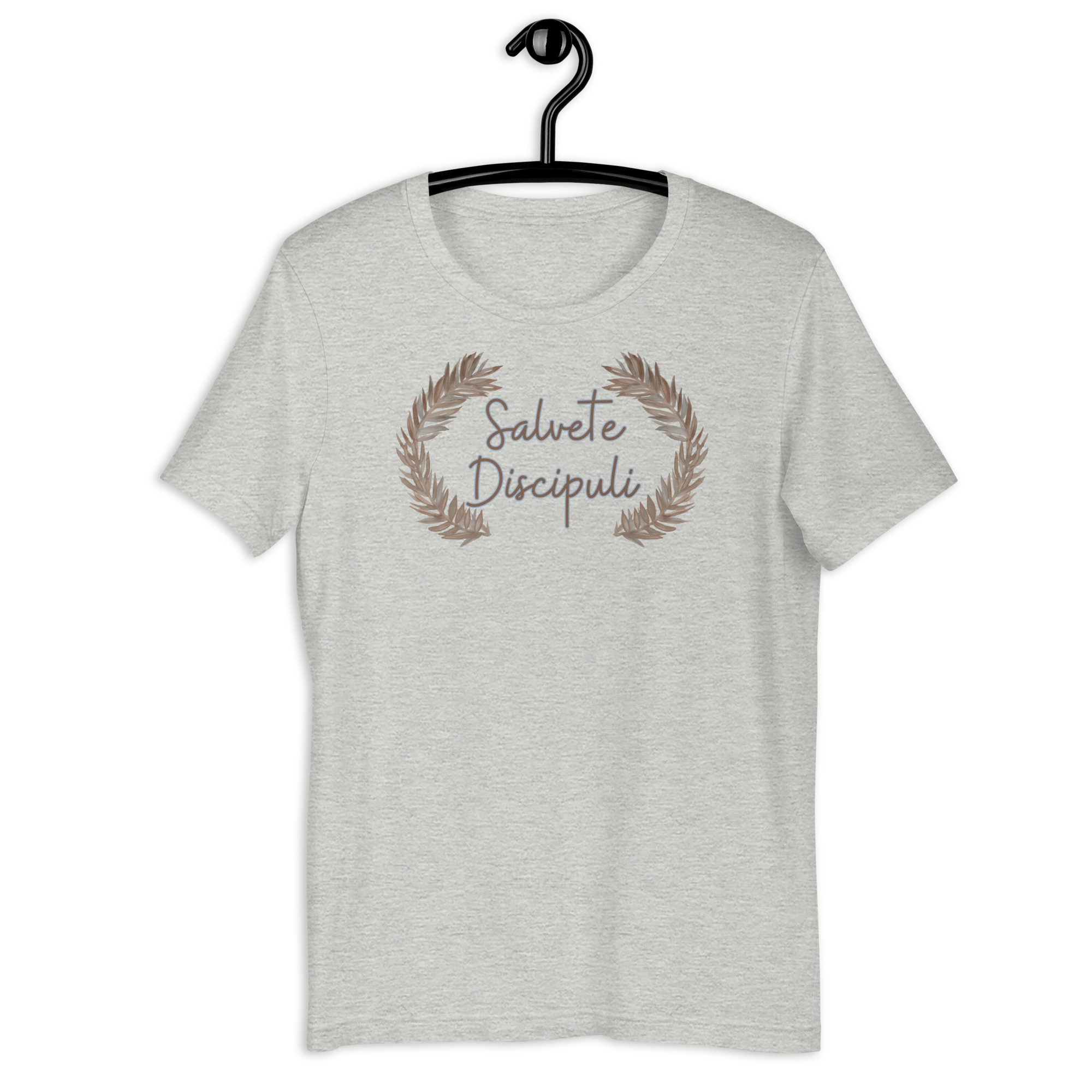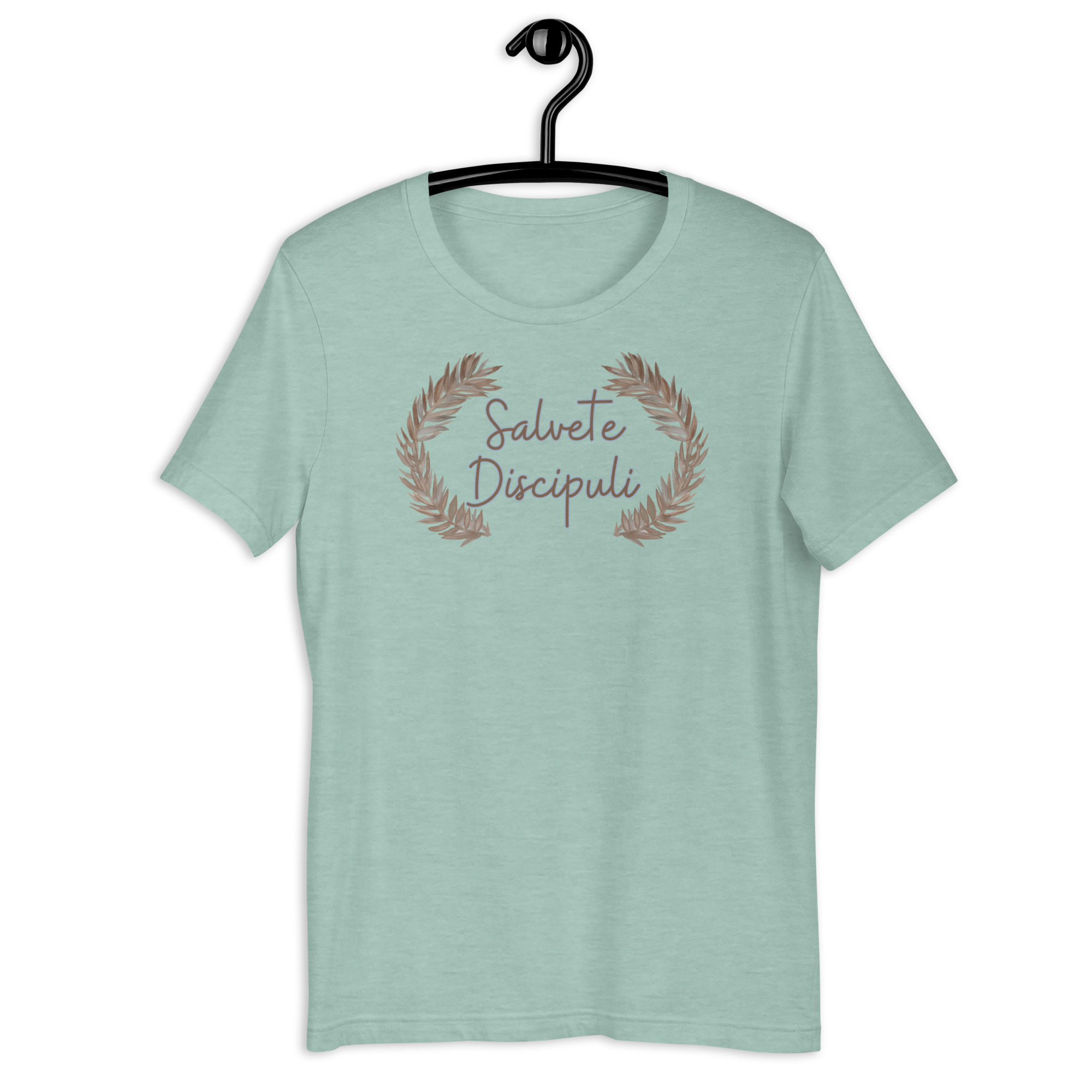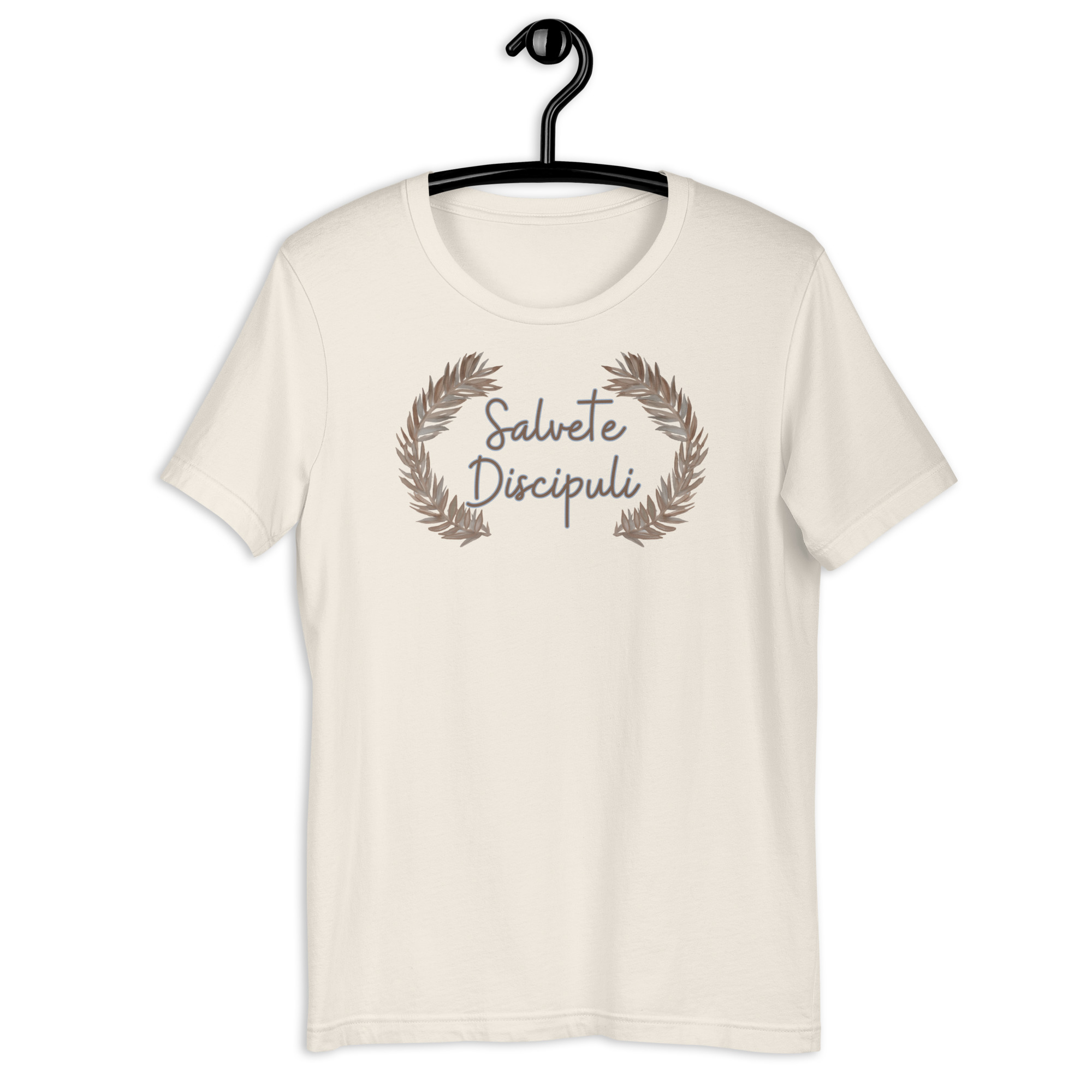Salvete Discipuli Latin Hello Students T-Shirt with laurel leaves.